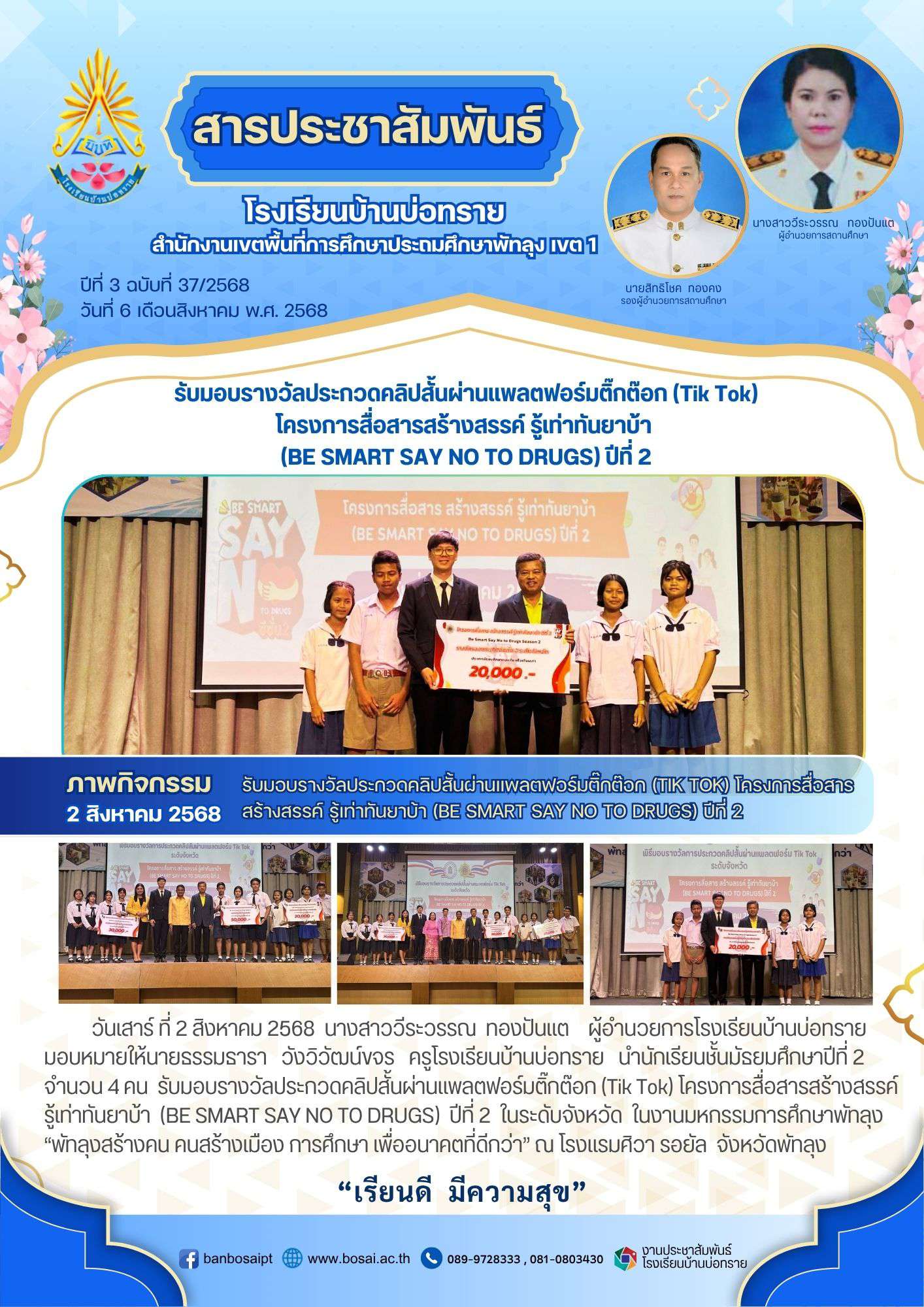 วันเสาร์ ที่ 2 สิงหาคม 2568 นางสาววีระวรรณ ทองปันแต ผู้อำนวยการโรงเรียนบ้านบ่อทราย มอบหมายให้นายธรรมธารา วังวิวัฒน์ขจร ครูโรงเรียนบ้านบ่อทราย นำนักเรียนชั้นมัธยมศึกษาปีที่ 2 จำนวน 4 คน รับมอบรางวัลประกวดคลิปสั้นผ่านแพลตฟอร์มติ๊กต๊อก (Tik Tok) โครงการสื่อสารสร้างสรรค์ รู้เท่าทันยาบ้า (BE SMART SAY NO TO DRUGS) ปีที่ 2 ในระดับจังหวัด ในงานมหกรรมการศึกษาพัทลุง “พัทลุงสร้างคน คนสร้างเมือง การศึกษา เพื่ออนาคตที่ดีกว่า” ณ โรงแรมศิวา รอยัล จังหวัดพัทลุง