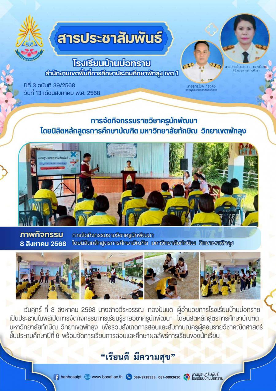 นางสาววีระวรรณ ทองปันแต ผู้อำนวยการโรงเรียนบ้านบ่อทราย เป็นประธานในพิธีเปิดการจัดกิจกรรมการเรียนรู้รายวิชาครูนักพัฒนา โดยนิสิตหลักสูตรการศึกษาบัณฑิต มหาวิทยาลัยทักษิณ วิทยาเขตพัทลุง เพื่อร่วมสังเกตการสอนและสัมภาษณ์ครูผู้สอนรายวิชาคณิตศาสตร์ ชั้นประถมศึกษาปีที่ 6 พร้อมจัดการเรียนการสอนและศึกษาผลลัพธ์การเรียนของนักเรียน