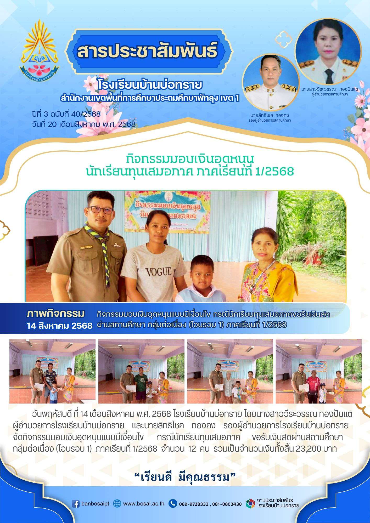 วันพฤหัสบดี ที่ 14 เดือนสิงหาคม พ.ศ. 2568 โรงเรียนบ้านบ่อทราย โดยนางสาววีระวรรณ ทองปันแต ผู้อำนวยการโรงเรียนบ้านบ่อทราย และนายสิทธิโชค ทองคง รองผู้อำนวยการโรงเรียนบ้านบ่อทราย กรณีนักเรียนทุนเสมอภาค ขอรับเงินสดผ่านสถานศึกษา กลุ่มต่อเนื่อง (โอนรอบ 1) ภาคเรียนที่ 1/2568 จำนวน 12 คน รวมเป็นจำนวนเงินทั้งสิ้น 23,200 บาท