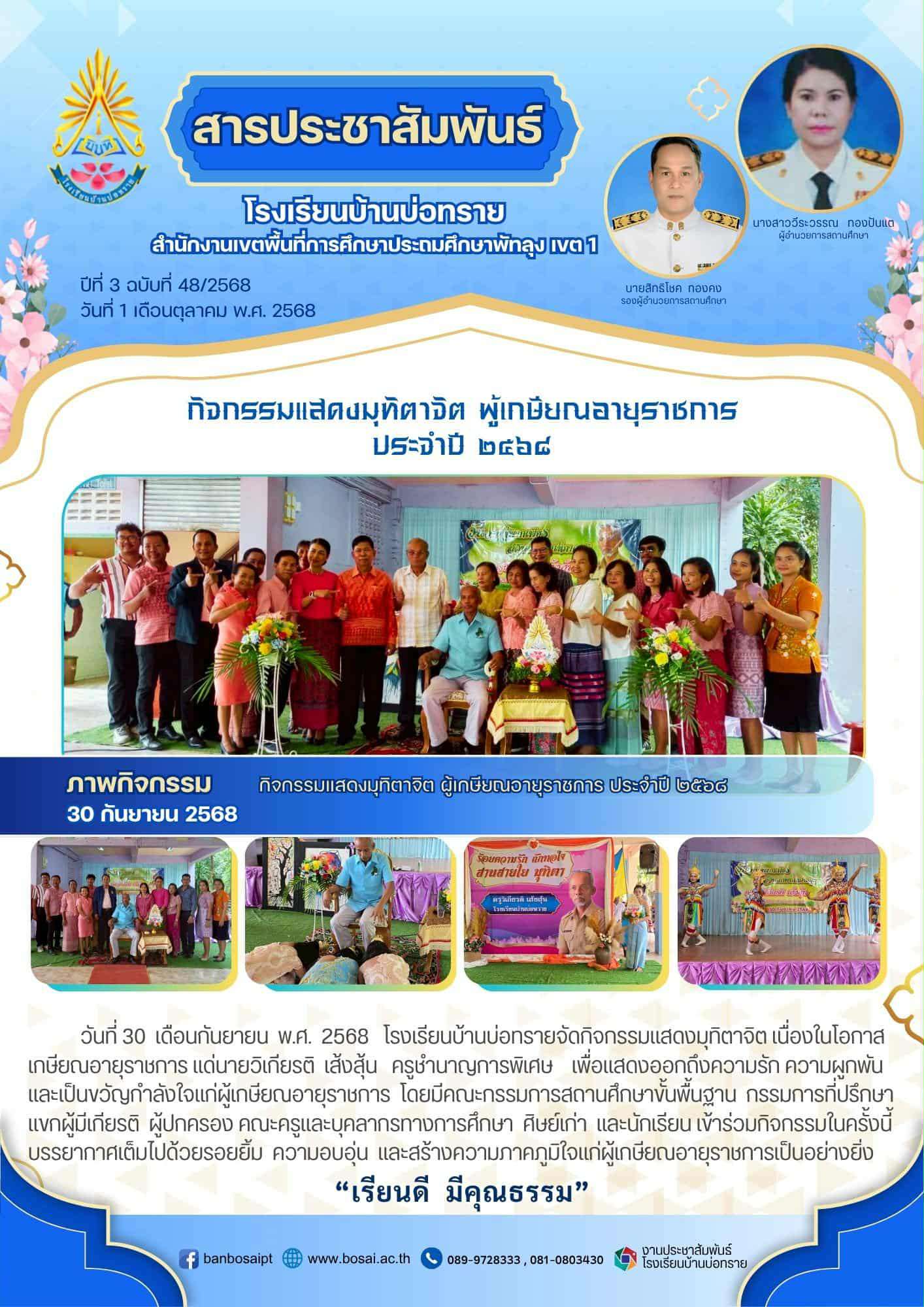 โรงเรียนบ้านบ่อทรายจัดกิจกรรมแสดงมุทิตาจิต เนื่องในโอกาสเกษียณอายุราชการ แด่นายวิเกียรติ เส้งสุ้น ครูชำนาญการพิเศษ เพื่อแสดงออกถึงความรัก ความผูกพัน และเป็นขวัญกำลังใจแก่ผู้เกษียณอายุราชการ โดยมีคณะกรรมการสถานศึกษาขั้นพื้นฐาน กรรมการที่ปรึกษา แขกผู้มีเกียรติ ผู้ปกครอง คณะครูและบุคลากรทางการศึกษา ศิษย์เก่า และนักเรียน เข้าร่วมกิจกรรมในครั้งนี้บรรยากาศเต็มไปด้วยรอยยิ้ม ความอบอุ่น และสร้างความภาคภูมิใจแก่ผู้เกษียณอายุราชการเป็นอย่างยิ่ง