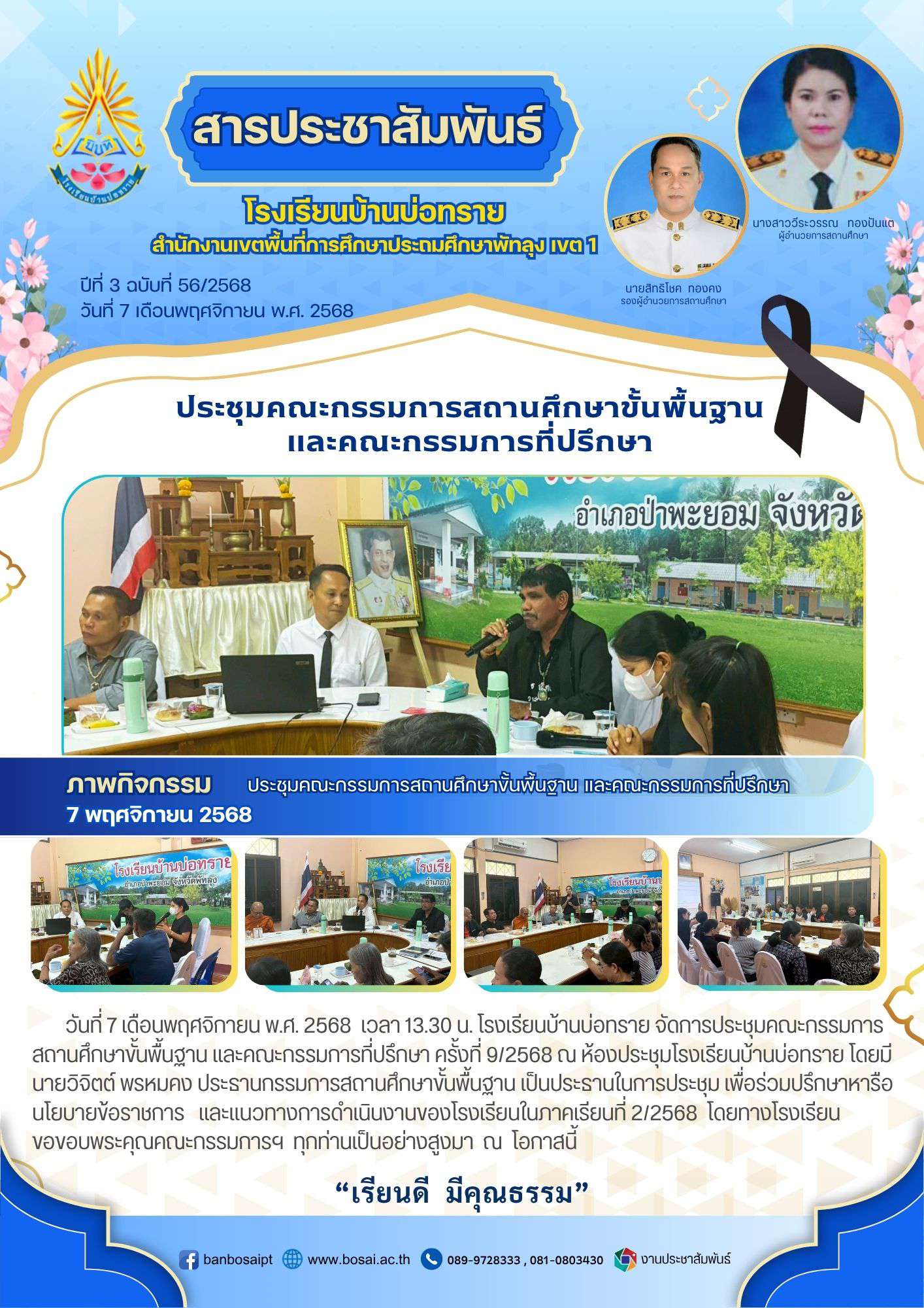 โรงเรียนบ้านบ่อทราย จัดการประชุมคณะกรรมการสถานศึกษาขั้นพื้นฐาน และคณะกรรมการที่ปรึกษา ครั้งที่ 9/2568 ณ ห้องประชุมโรงเรียนบ้านบ่อทราย โดยมีนายวิจิตต์ พรหมคง ประธานกรรมการสถานศึกษาขั้นพื้นฐาน เป็นประธานในการประชุม เพื่อร่วมปรึกษาหารือนโยบายข้อราชการ และแนวทางการดำเนินงานของโรงเรียนในภาคเรียนที่ 2/2568 โดยทางโรงเรียนขอขอบพระคุณคณะกรรมการฯ ทุกท่านเป็นอย่างสูงมา ณ โอกาสนี้