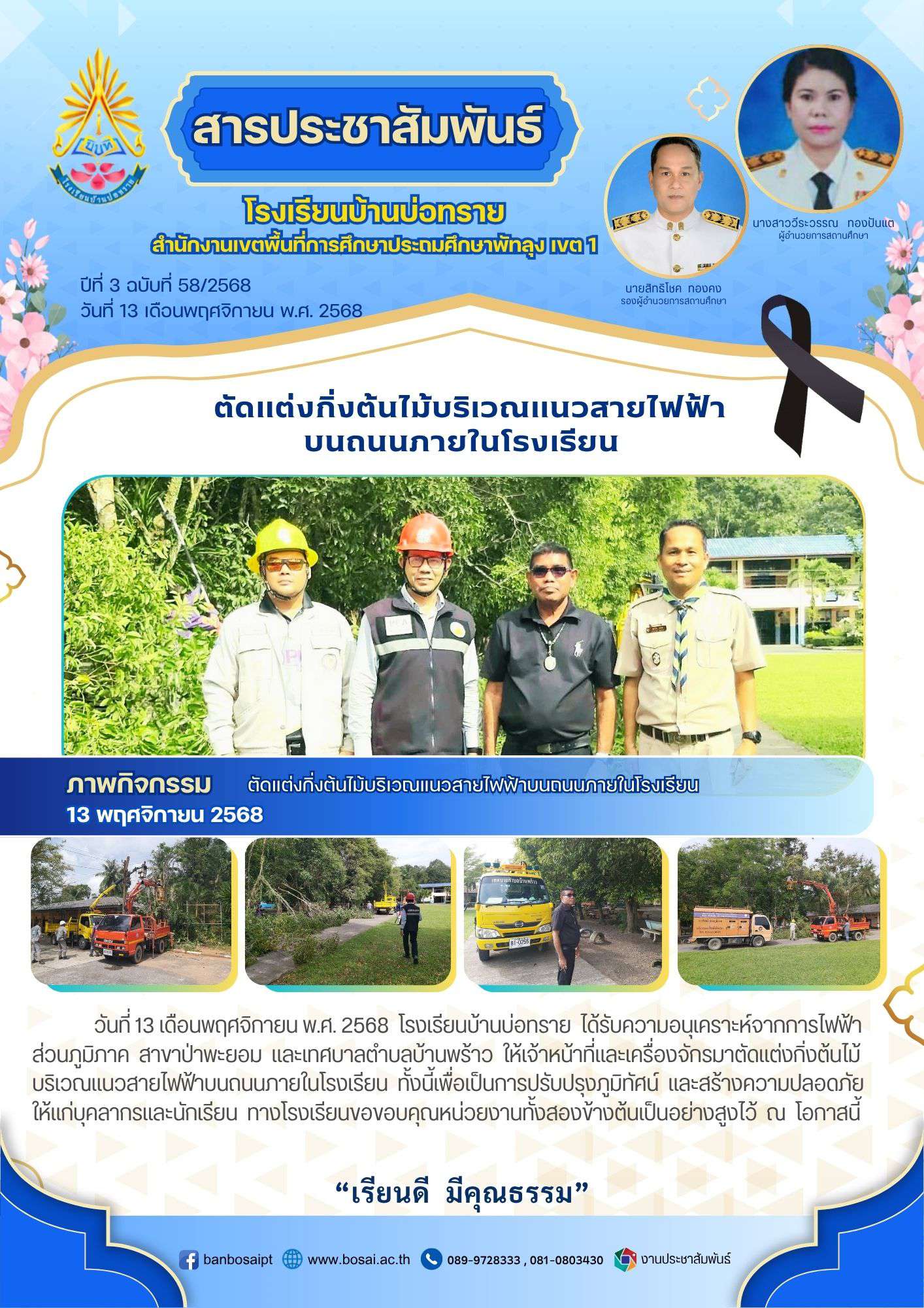 โรงเรียนบ้านบ่อทราย ได้รับความอนุเคราะห์จากการไฟฟ้าส่วนภูมิภาค สาขาป่าพะยอม และเทศบาลตำบลบ้านพร้าว ให้เจ้าหน้าที่และเครื่องจักรมาตัดแต่งกิ่งต้นไม้บริเวณแนวสายไฟฟ้าบนถนนภายในโรงเรียน ทั้งนี้เพื่อเป็นการปรับปรุงภูมิทัศน์ และสร้างความปลอดภัยให้แก่บุคลากรและนักเรียน ทางโรงเรียนขอขอบคุณหน่วยงานทั้งสองข้างต้นเป็นอย่างสูงไว้ ณ โอกาสนี้