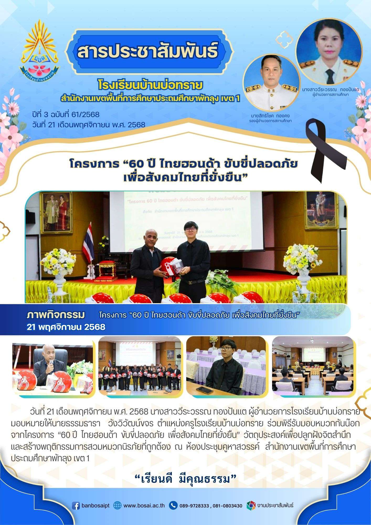 นางสาววีระวรรณ ทองปันแต ผู้อำนวยการโรงเรียนบ้านบ่อทราย มอบหมายให้นายธรรมธารา วังวิวัฒน์ขจร ตำแหน่งครูโรงเรียนบ้านบ่อทราย ร่วมพิธีรับมอบหมวกกันน็อก จากโครงการ “60 ปี ไทยฮอนด้า ขับขี่ปลอดภัย เพื่อสังคมไทยที่ยั่งยืน” วัตถุประสงค์เพื่อปลูกฝังจิตสำนึกและสร้างพฤติกรรมการสวมหมวกนิรภัยที่ถูกต้อง ณ ห้องประชุมคูหาสวรรค์ สำนักงานเขตพื้นที่การศึกษาประถมศึกษาพัทลุง เขต 1